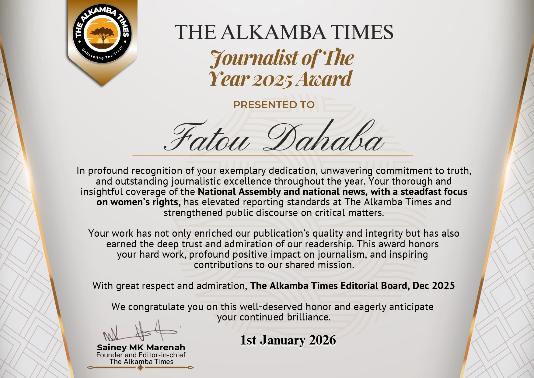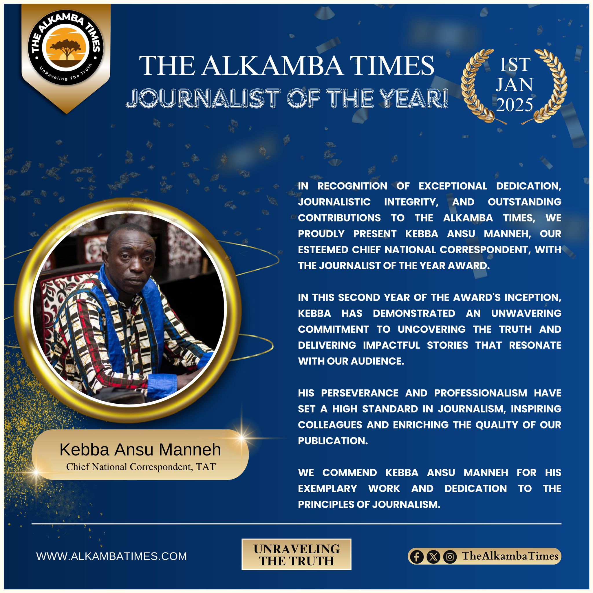 As we celebrate these remarkable achievements, we reaffirm our belief that investing in people is investing in the future of independent journalism. To all our award winners—and to every staff member whose daily contributions keep The Alkamba Times moving forward—we say thank you. Your hard work does not go unnoticed.