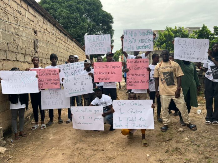 A group of furious Bakoteh residents, clad in white shirts symbolizing purity amid filth, stormed the notorious roadside Bakoteh dumpsite on Monday morning, waving banners that screamed “We Can’t Breathe” and “Enough Is Enough.” The protest paralyzed dumping activities along the Bakoteh-Manjai Kunda highway, as residents and young protesters demanded the immediate closure of the overflowing site, which has poisoned their air for decades.