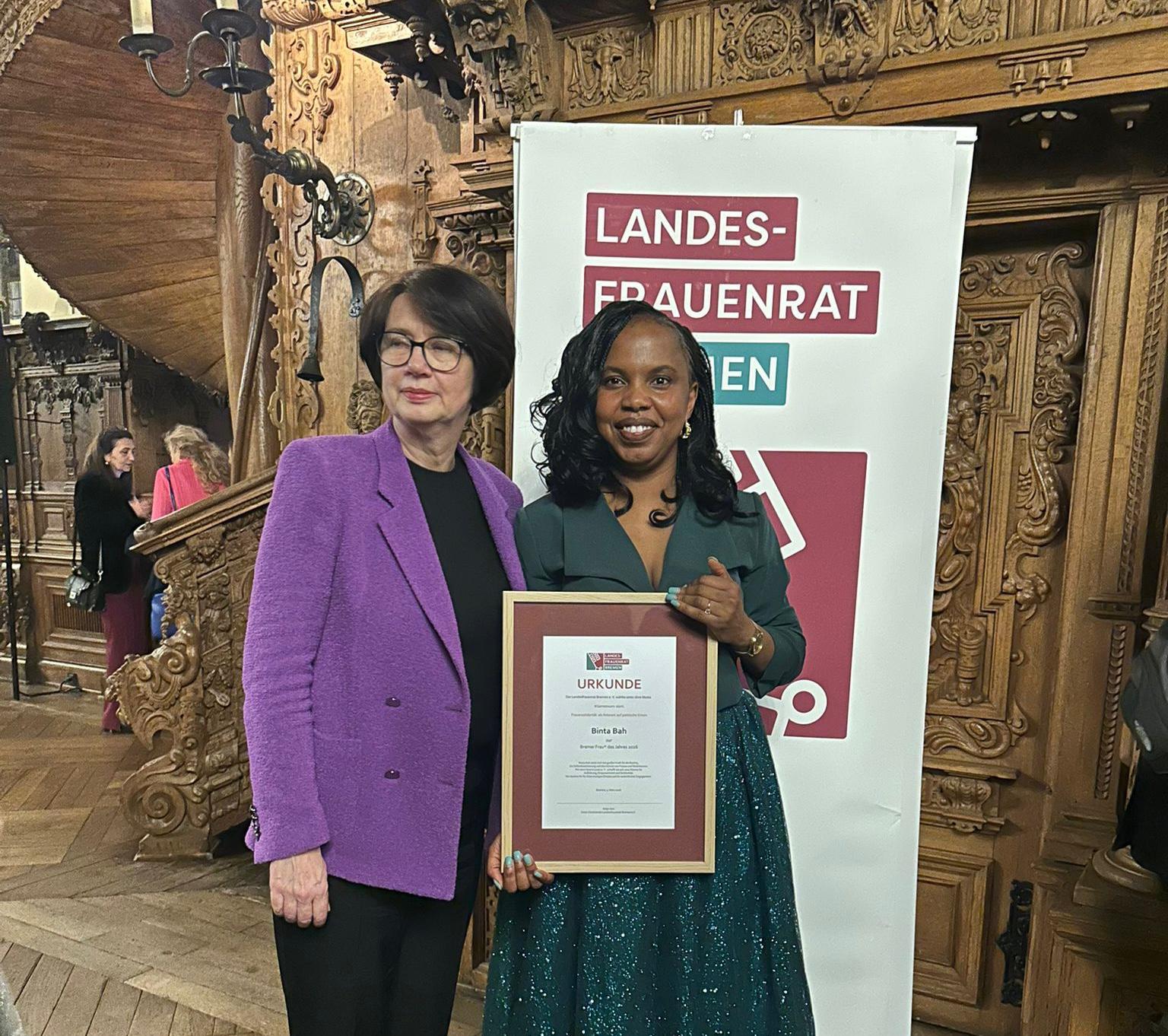 The prestigious award was presented by the Bremen State Women’s Council (Landesfrauenrat Bremen) during a Senate reception at Bremen Town Hall on March 5, 2026. The ceremony, held under the motto “Strong together: women’s solidarity as an answer to political crises,” highlighted Bah’s contributions as a beacon of resilience and solidarity.