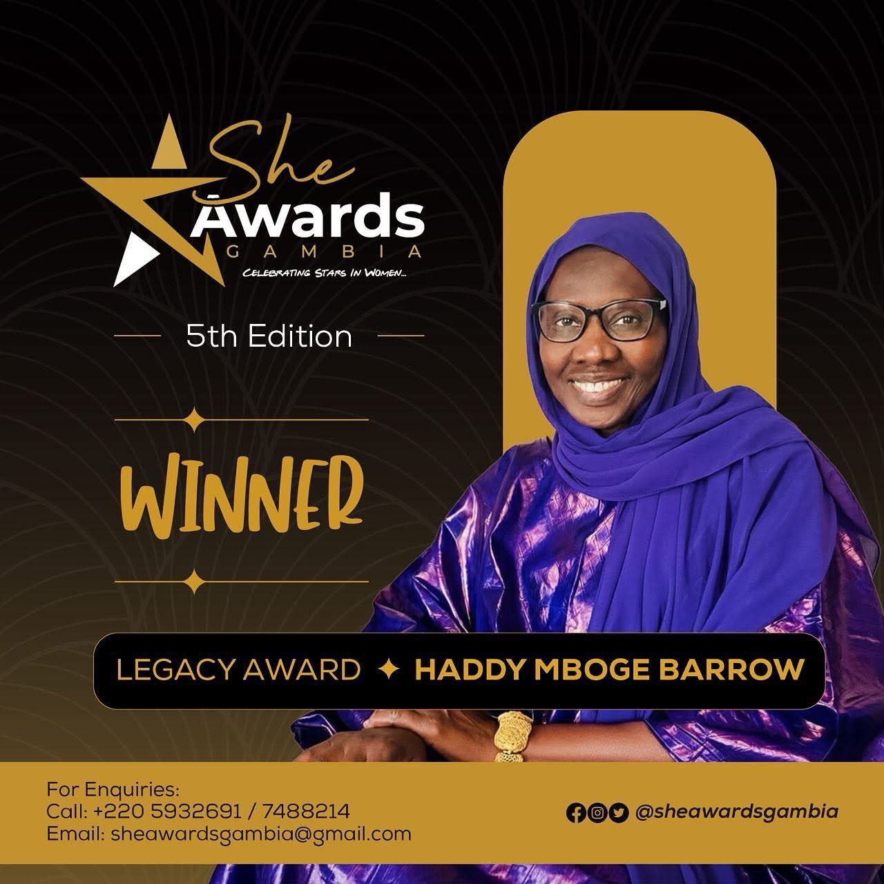 In a heartfelt recognition of decades of dedication to protecting women and girls, She Awards Gambia has presented the prestigious Legacy Award to Haddy Mboge Barrow, a trailblazing advocate and founder of the Network Against Gender-Based Violence (NGBV).
