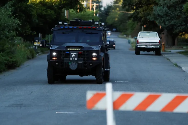 An armoured police vehicle leaves an area where firefighters were attacked while responding to a fire in the Canfield Mountain area outside Coeur d'Alene, Idaho, US, June 29, 2025 [Young Kwak/Reuters]