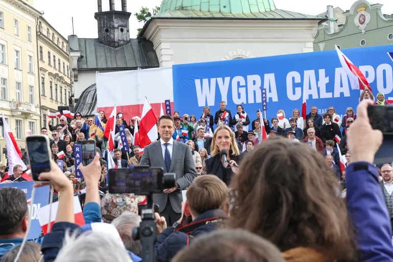 Looking visibly tired at his rally on Tuesday, Rafal Trzaskowski of the ruling centre-right Civic Platform, stood on a platform at Krakow’s central Market Square amid a large crowd cheering his name, blue European flags fluttering beside the white-and-red Polish ones.
