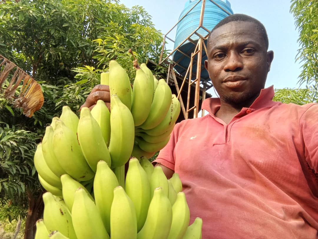 A promising young rural farmer tending to his banana farms.