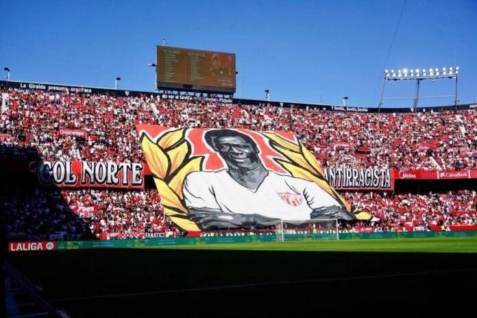 Last weekend, Sevilla FC defeated Barcelona — a huge win by any standard. But amid the jubilation, one sight stood out: a massive flag of a Gambian legend sweeping through the stadium. His name? Biri Biri.