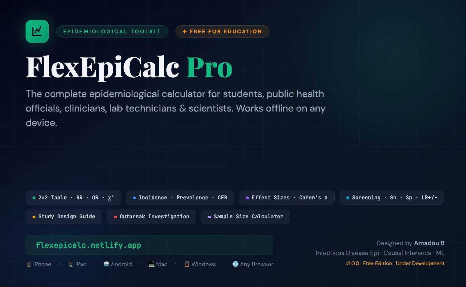 What sets FlexEpiCalc Pro apart is its user-friendly design and offline capability. The progressive web app works on any device—smartphones, tablets, or computers—and can be installed for offline use, ideal for fieldwork in remote areas or low-connectivity settings like clinics and classrooms.